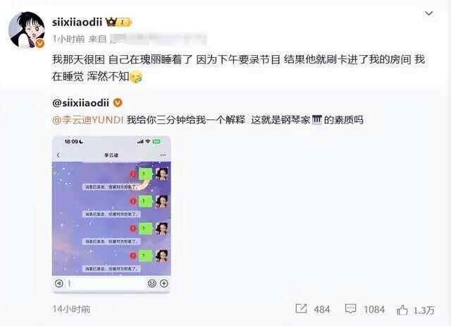 随后,该条博文被删除,李云迪方未回应,司晓迪在微博保留发文“我真的很讨厌李云迪了!!!”
