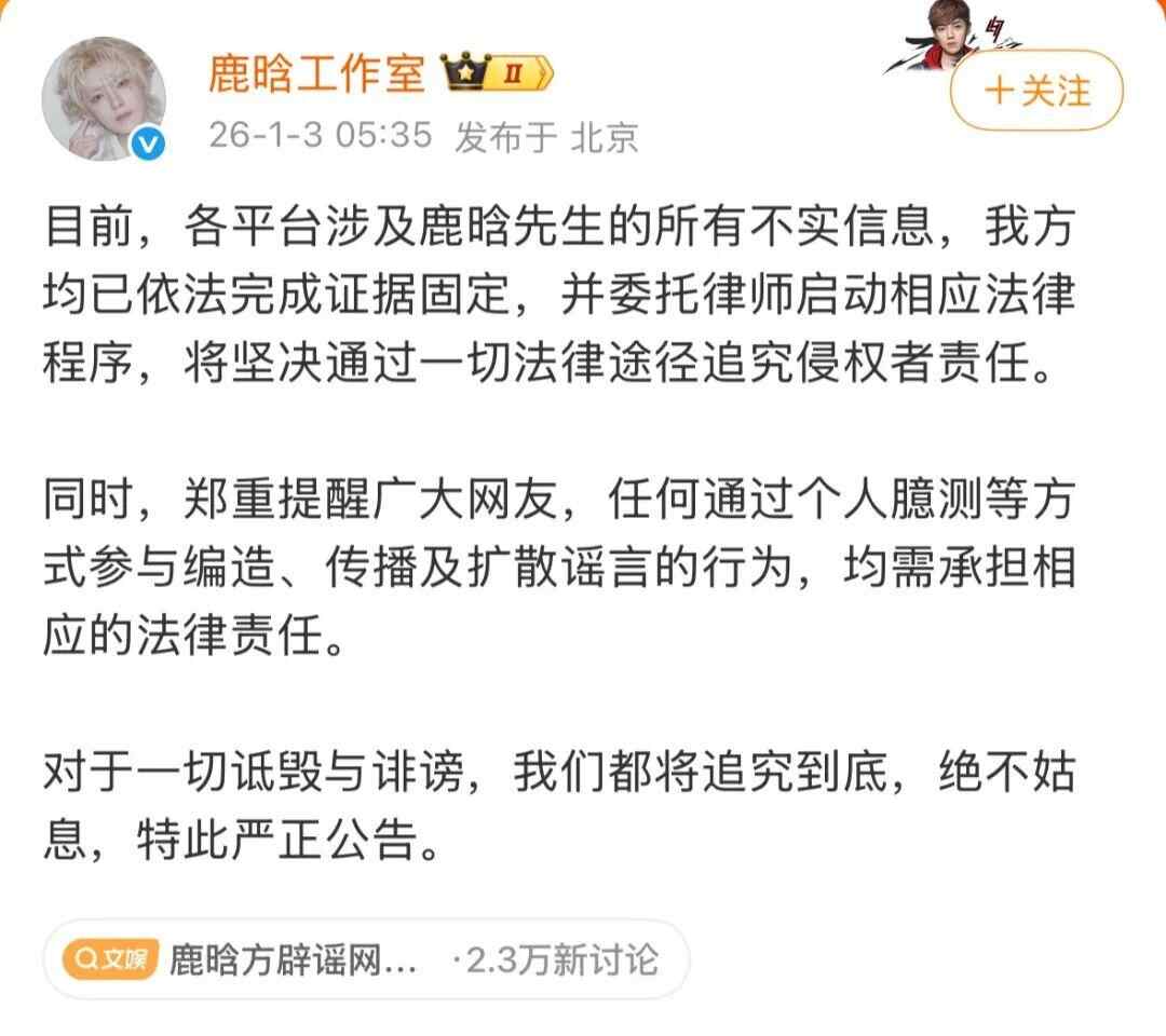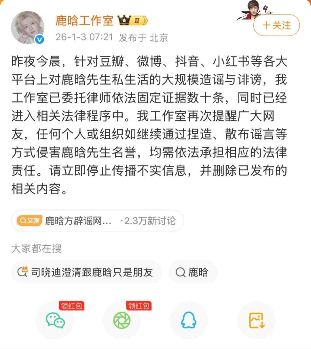 鹿晗工作室发文:昨夜今晨,针对豆瓣,微博,抖音,小红书等各大平台上对鹿晗先生私生活的大规模造谣与诽谤,我工作室已委托律师依法固定证据数十条,同时已经进入相关法律程序中。我工作室再次提醒广大网友,任何个人或组织如继续通过捏造,散布谣言等方式侵害鹿晗先生名誉,均需依法承担相应的法律责任。请立即停止传播不实信息,并删除已发布的相关内容。