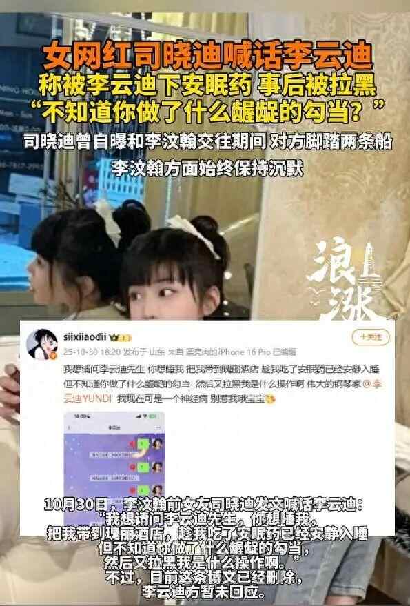 2025年10月30日晚,网红司晓迪通过微博实名指控钢琴家李云迪,称其在酒店趁其服药入睡后实施不当行为并拉黑,事件引发舆论热议。