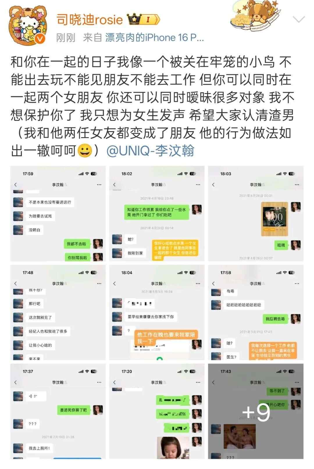 此前,司晓迪已在社交平台接连发文,控诉李汶翰在恋爱期间对其精神控制,并同时与三位女性保持暧昧关系。她晒出聊天记录、照片及视频片段,称自己被限制自由如“笼中鸟”,威胁李汶翰“不想被曝光就联系我”,并喊话李汶翰向其道歉。