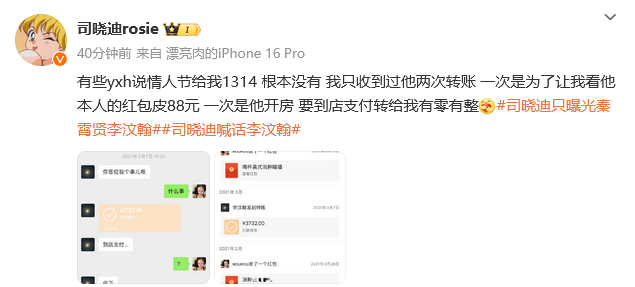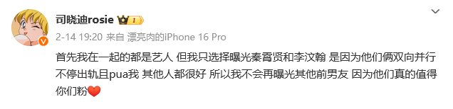 司晓迪还称自己曾与多位艺人恋爱,之所以曝光秦霄贤与李汶翰,只因二人多次出轨,且对其进行PUA。