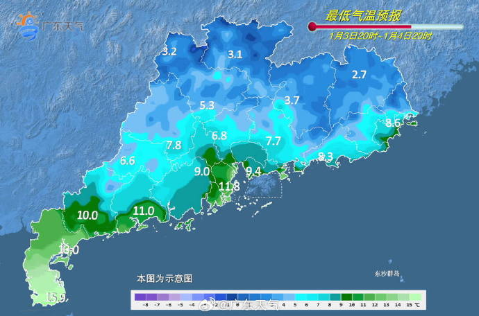 6日,广东省大部晴到多云,昼夜温差大,早晚寒冷。最低气温:粤北、珠三角北部市县2℃~6℃,其中高海拔山区-1℃~1℃,有霜冻和局地冰冻,粤西沿海市县11℃~15℃,其余市县7~10℃。