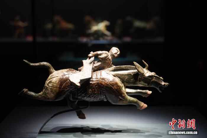 1月1日,“印迹——古代陶瓷中的马”专题展览在河南郑州大象陶瓷博物馆开展,该展览汇聚战国至唐代百余件神态各异、造型不一的陶、瓷马,再现马在中国古代历史中的多维角色与文化意义。图为展出的汉代绿釉勇士骑马飞奔俑。中新社记者 韩章云 摄