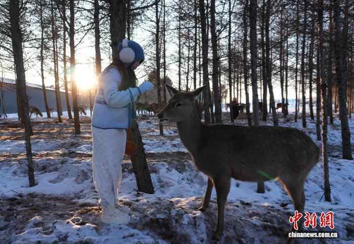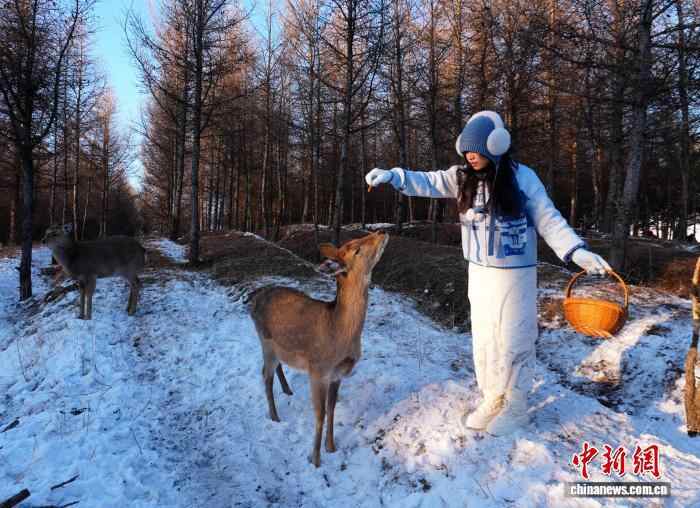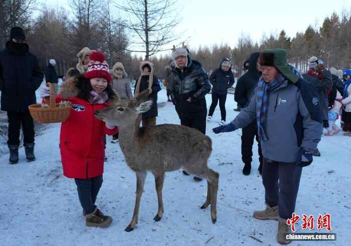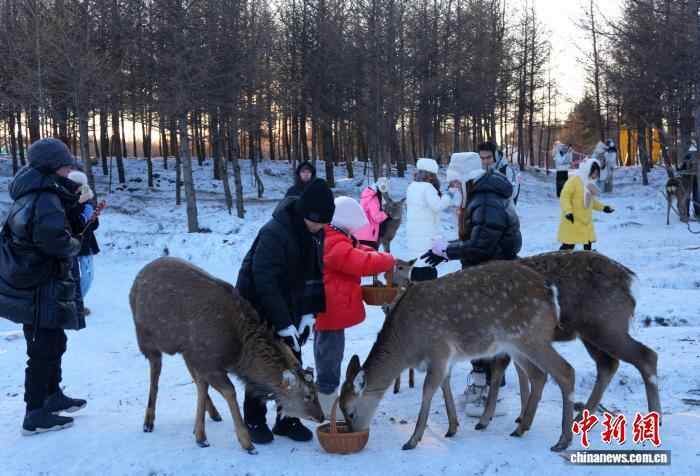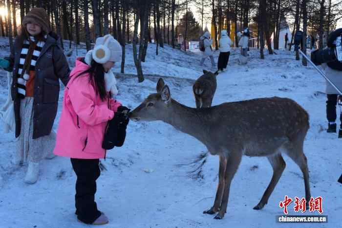 1月1日,游客在内蒙古赤峰市乌兰布统大草原踏雪游玩,喂食梅花鹿,喜迎元旦。中新社记者 赵隽 摄