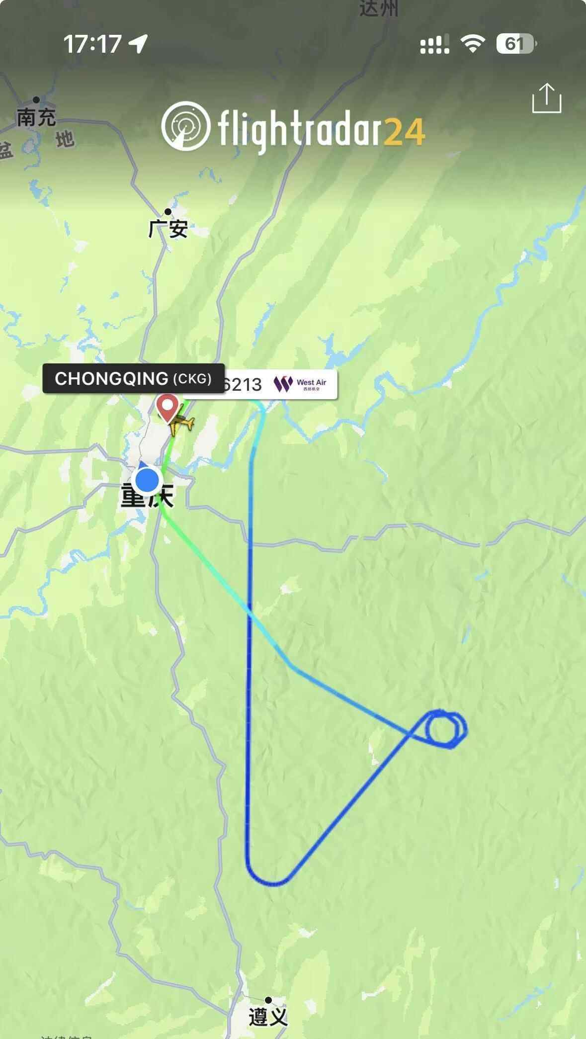 记者查询专业航班信息查询软件“Flightradar24”看到,PN6213航班执飞机型为空客A321-211,1日早上6时52分从江北国际机场起飞,在贵州省务川县上空盘旋两圈后返航。