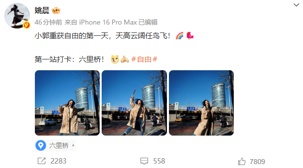 1月2日上午,姚晨发文:小郭重获自由的第一天,天高云阔任鸟飞!
