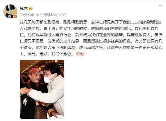 1月2日,成龙发文悼念袁祥仁。“这几天每天都忙到很晚,刚刚得到消息,袁祥仁师兄离开了我们……小时候我刚进入戏剧学校,跟于占元师父学习的时候,就知道我们有两位师兄,袁和平和袁祥仁,他们很早就进入电影行业,后来成为我们在业界的前辈,提携过很多人。袁祥仁师兄不仅是一位优秀的动作指导,而且塑造过很多经典的角色,有时即使只有几个镜头,也能给人留下深刻印象,成为点睛之笔,让这些人物形象一直留在观众心中。师兄,走好,我们怀念您。”