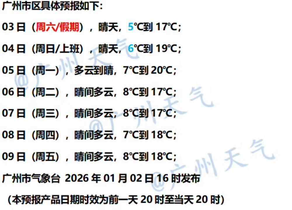 广州市气象台1月2日预计,1月3日广州以晴天为主,受冷空气和晴空辐射共同影响,3日早晨最低气温北部3~5℃(山区-2~1℃,局部有霜/冰冻),中部5~7℃,南部7~9℃。预计4日后广州仍受频繁补充的冷空气影响,维持晴朗干燥天气,气温小幅波动。