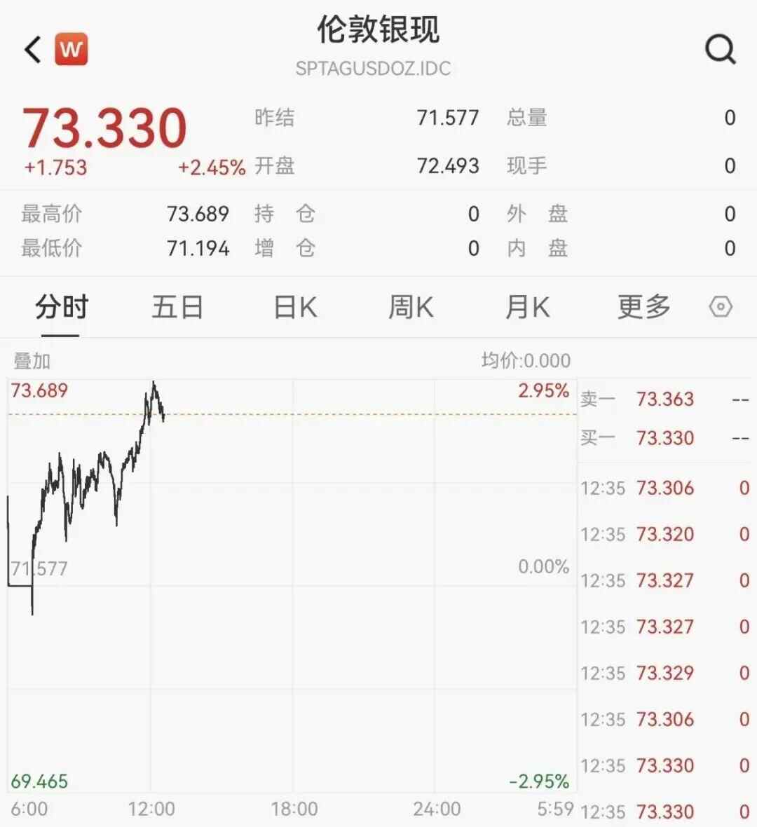 现货白银日内涨幅一度扩大至3%,向上触及73美元/盎司。
