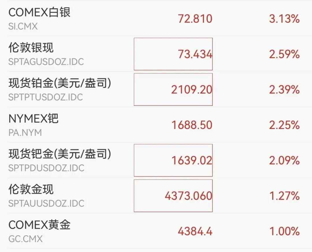 此外,现货铂金、现货钯金纷纷走高,涨超2%。