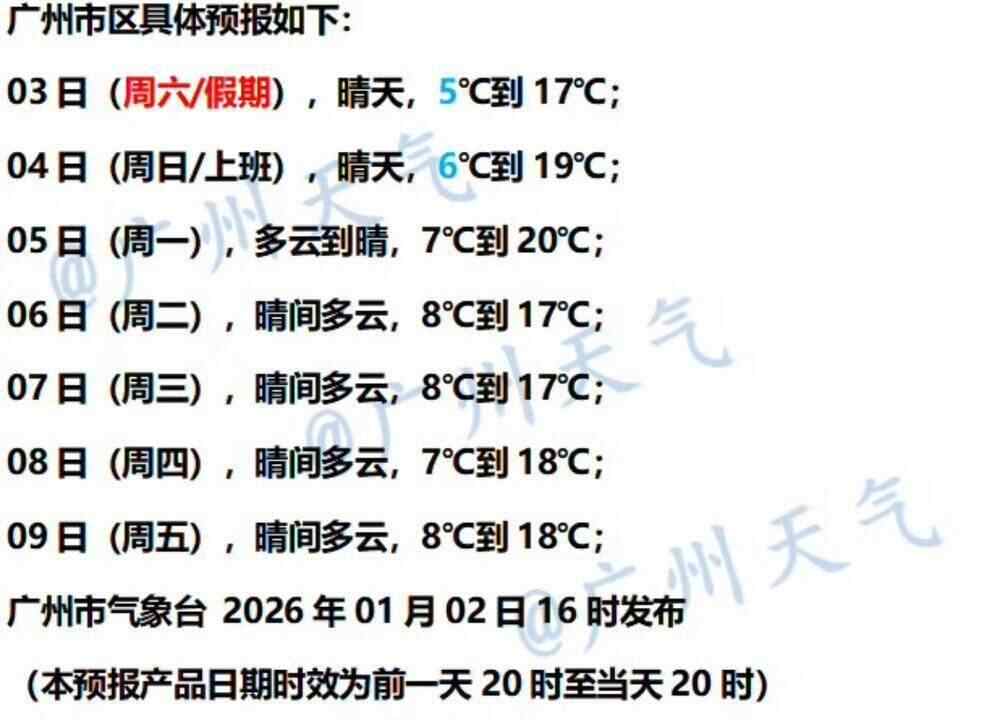 广州市气象台1月2日预计,1月3日广州以晴天为主,受冷空气和晴空辐射共同影响,3日早晨最低气温北部3~5℃(山区-2~1℃,局部有霜/冰冻),中部5~7℃,南部7~9℃。预计4日后广州仍受频繁补充的冷空气影响,维持晴朗干燥天气,气温小幅波动。