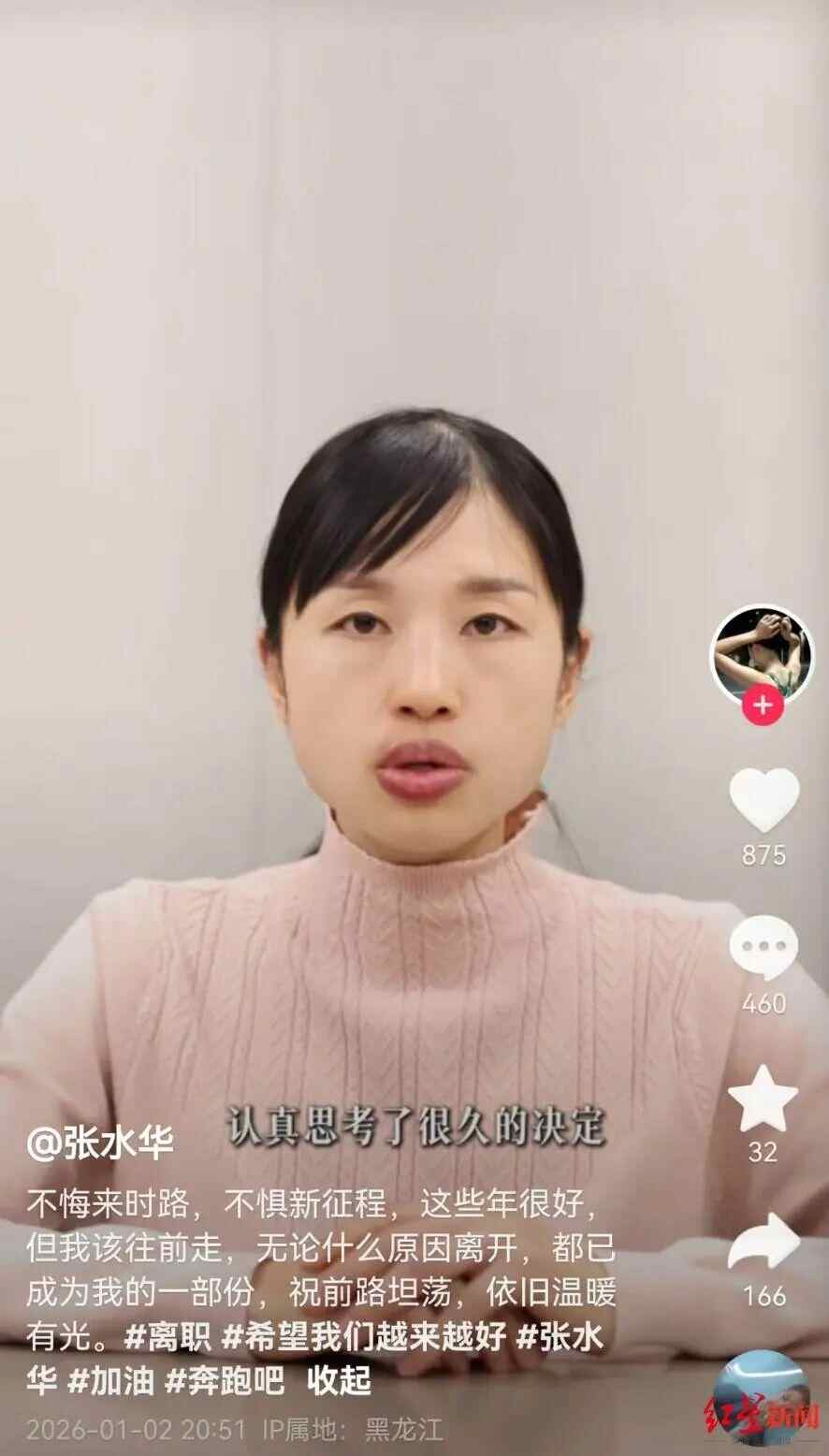 1月2日,张水华宣布辞职:不悔来时路,不惧新征程,这些年很好,但我该往前走,无论什么原因离开,都已成为我的一部分,祝前路坦荡,依旧温暖有光。