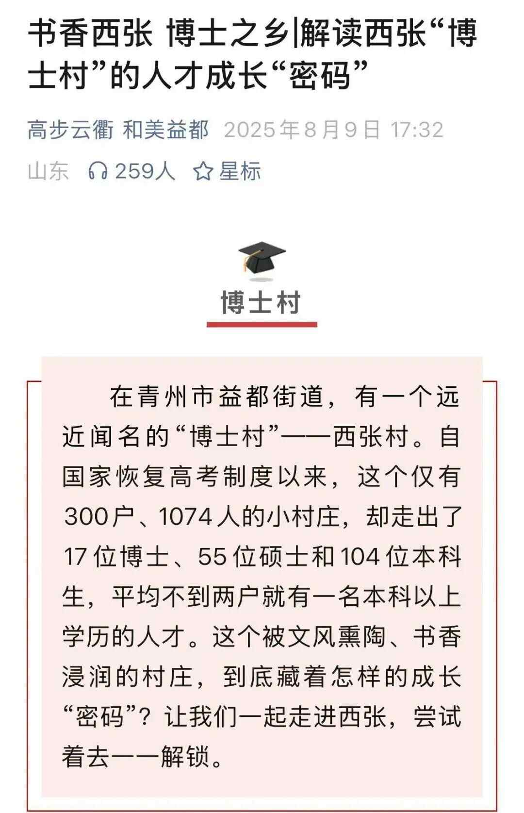 据益都街道官方微信公众号消息,西张村又被称为“博士村”,自国家恢复高考制度以来,截至今年8月,这个仅300户、1074人的村庄,已走出17位博士、55位硕士及104名本科生,平均不到两户就有一名本科以上学历人才。