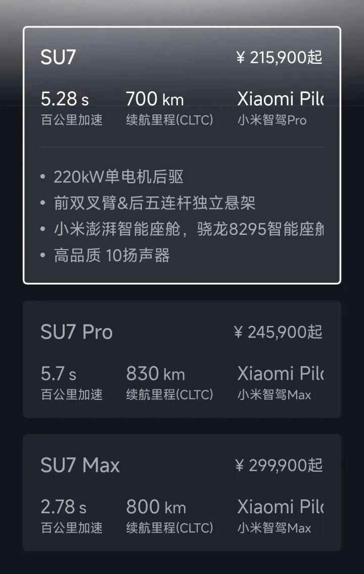 小米SU7共三个版本,分别为标准版、Pro版、Max版,其中标准版21.59万元、Pro版24.59万元、Max版29.99万元。此外还有小米SU7创始版(同样分为标准版和PRO版,价格一样),全国限量5000台。