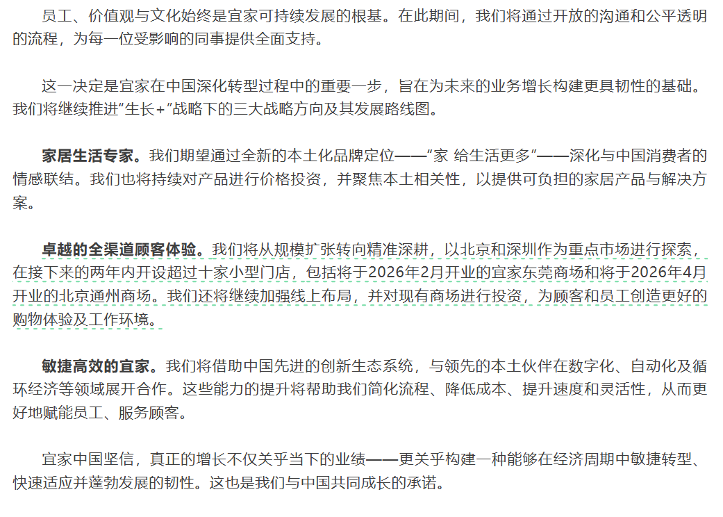 宜家称此举为优化渠道布局、构建业务韧性。宜家表示,未来将转向“精准深耕”,在北京、深圳等重点城市开设小型门店,并加强线上布局。