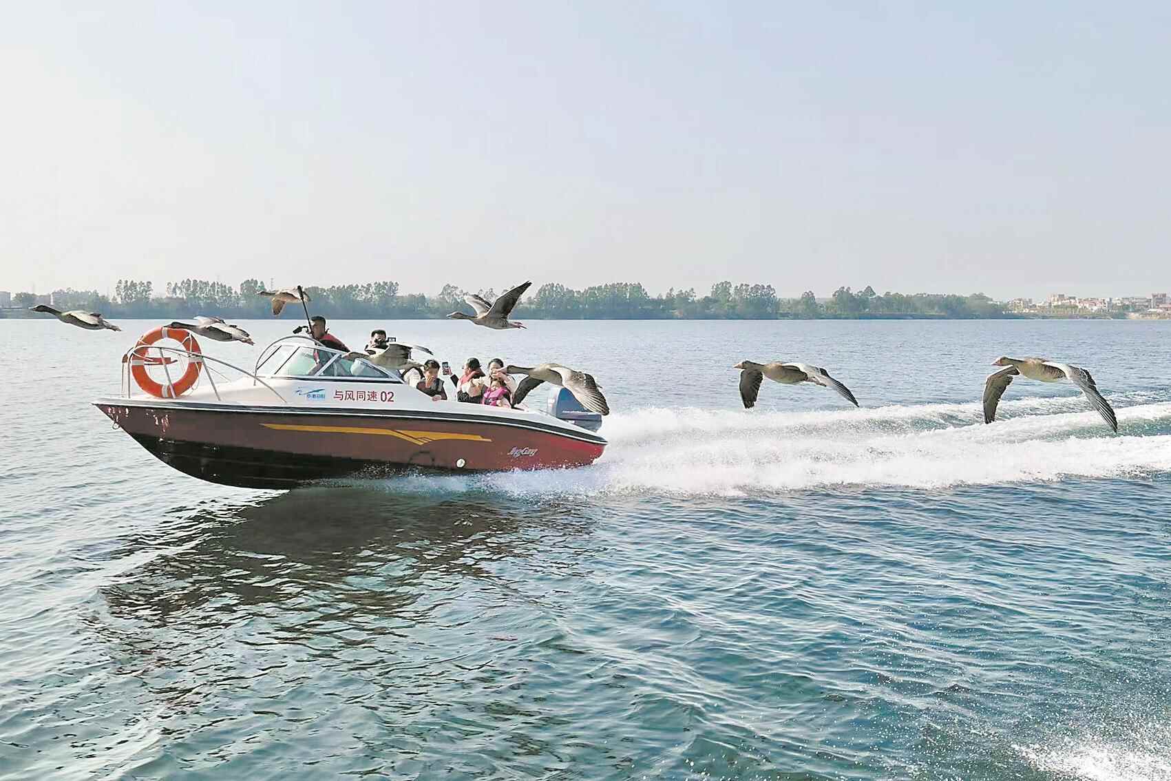 快艇劈开碧波,一群大雁振翅相随,时而掠过水面、时而盘旋船头。新年首周,刚开放的茂名露天矿生态公园雁遇码头迎来不少游客抢先体验。该项目是粤西乃至华南首个以“快艇追雁、雁群伴飞”为核心的沉浸式生态体验项目,为茂名“生态+文旅”融合发展注入新动能。
