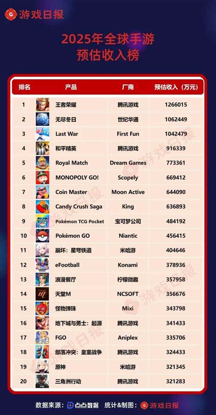 基于点点数据预估,游戏日报统计了2025年度全球移动端游戏收入TOP50榜单(iOS+Google Play,不包含国内安卓渠道),TOP50产品在2025年总收入约为1776.97亿元。
