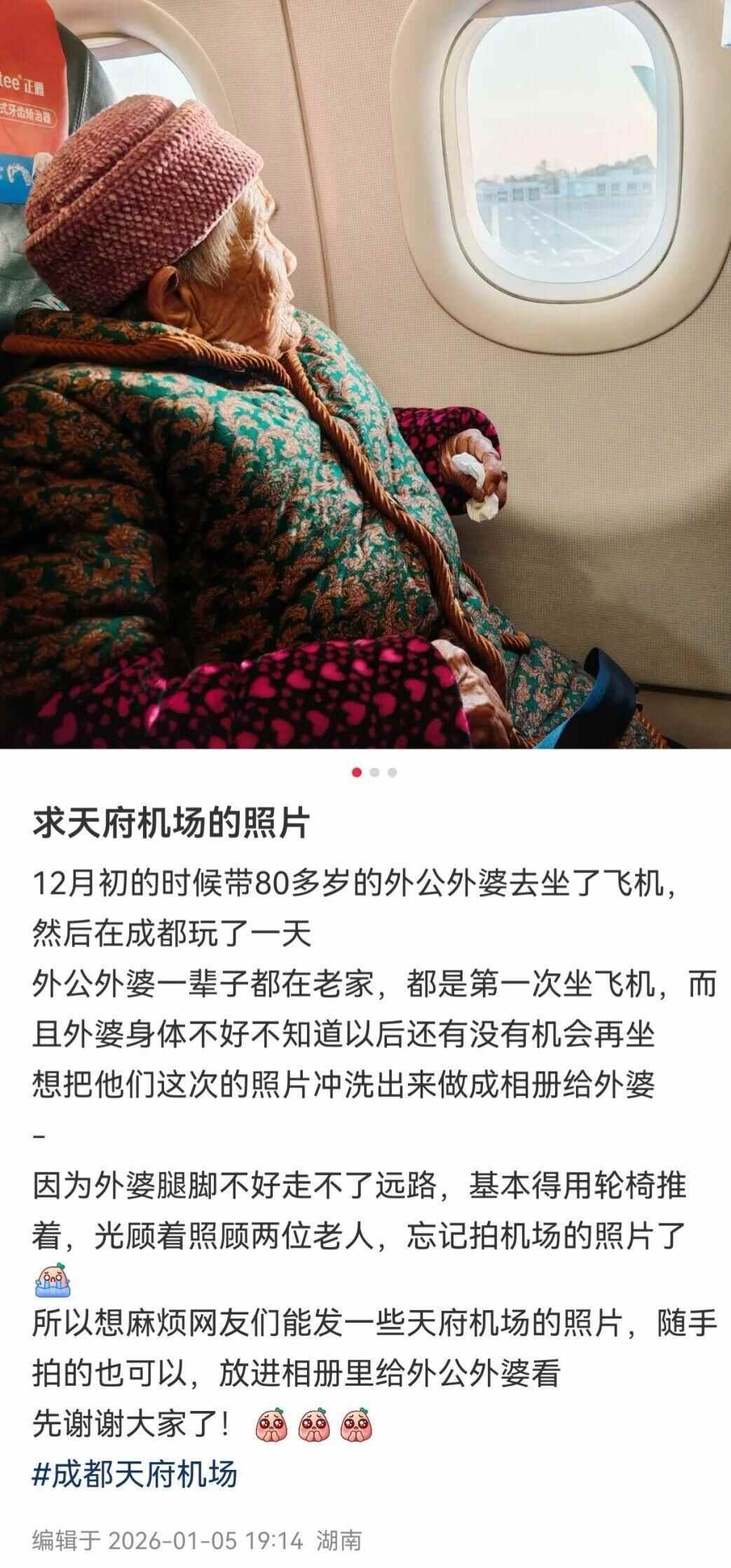 “光顾着照顾两位老人,忘记拍机场的照片了。”1月5日,一名来自湖南湘西的网友发帖,“求天府机场的照片……”