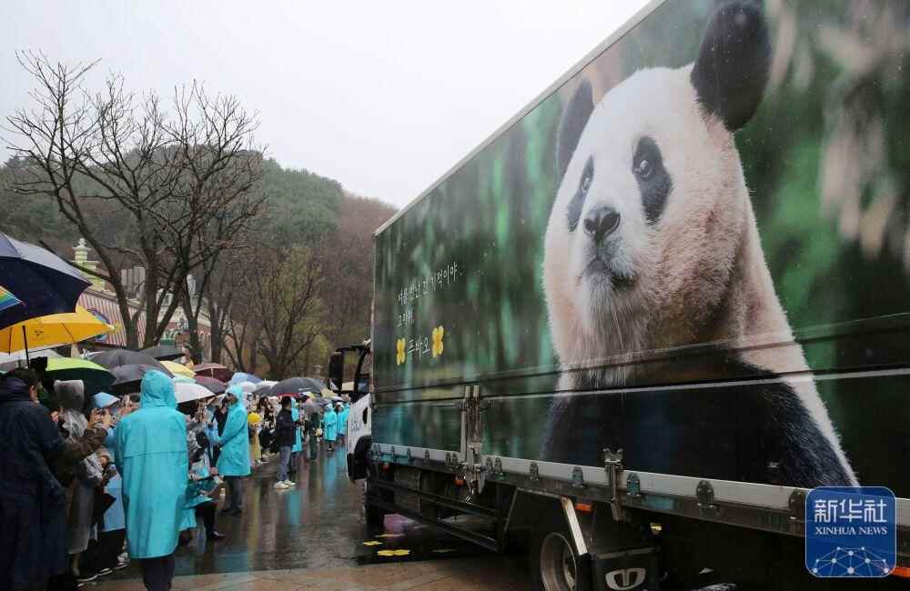 ↑2024年4月3日,韩国民众在龙仁市的爱宝乐园雨中送别大熊猫“福宝”。当天旅韩大熊猫“福宝”启程回国。