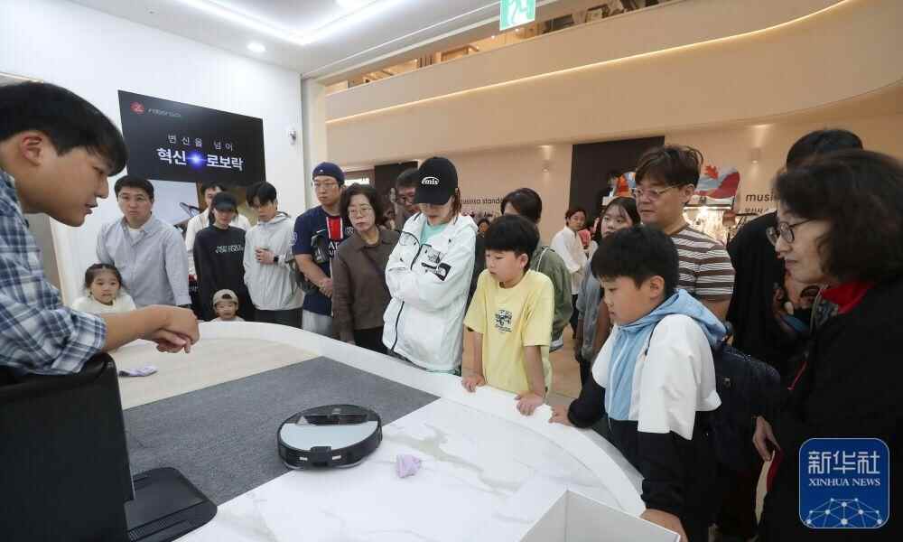 ↑2025年10月12日,在韩国首尔近郊的一家大型购物中心,韩国消费者观看中国品牌扫地机器人演示。