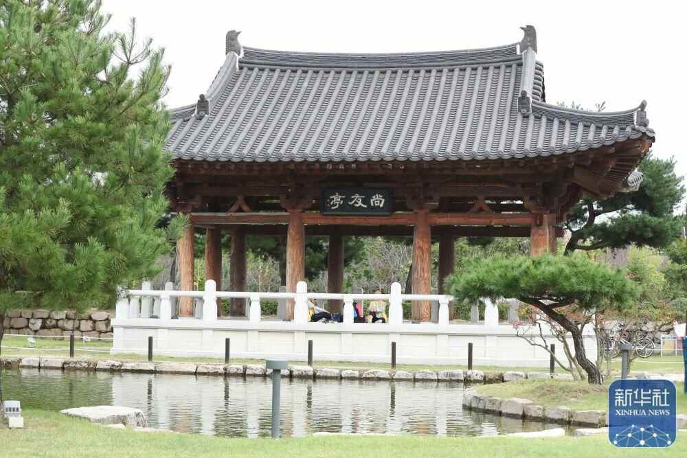↑2025年10月17日,市民在韩国庆州的“韩中友好林”公园里的尚友亭休息。