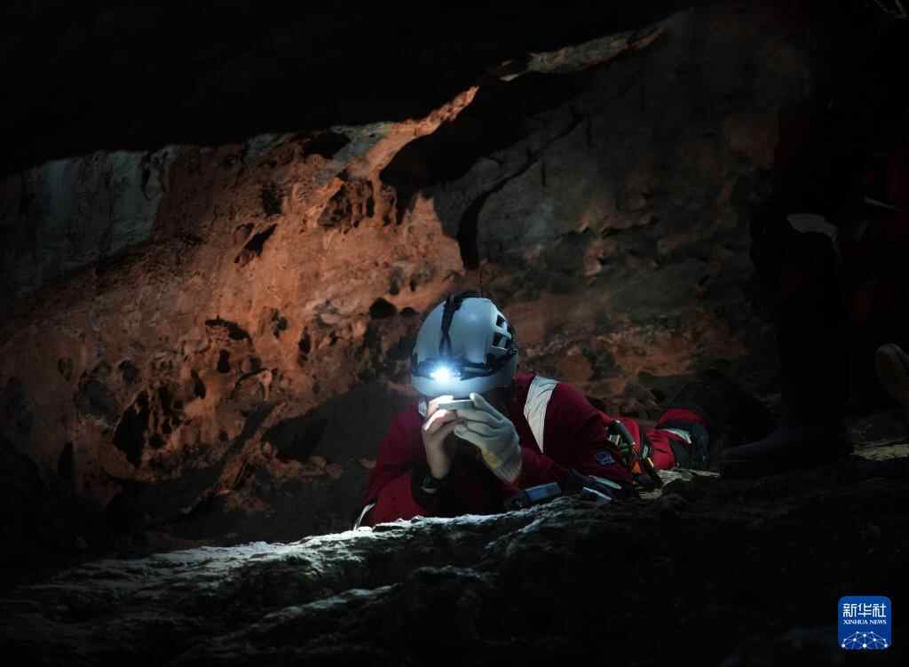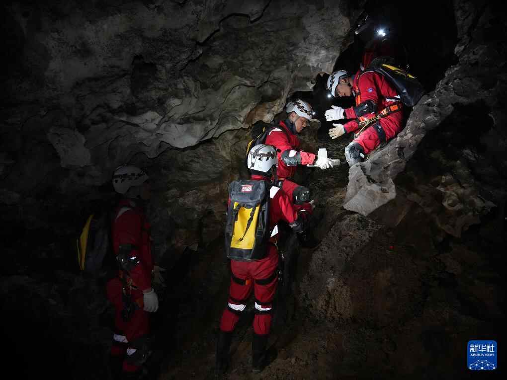 2025年12月,航天员在洞穴中进行物品传递协作训练。