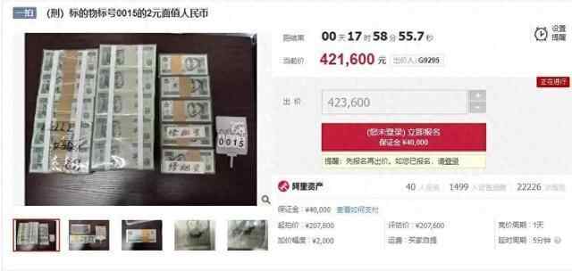 1月4日,浙江温州市永嘉县人民法院以20.76万元起拍价,在阿里法拍平台拍卖10500张2元面值人民币,引来40人争抢。截至4日19时,叫价已高达42万余元,竞拍仍在继续中。