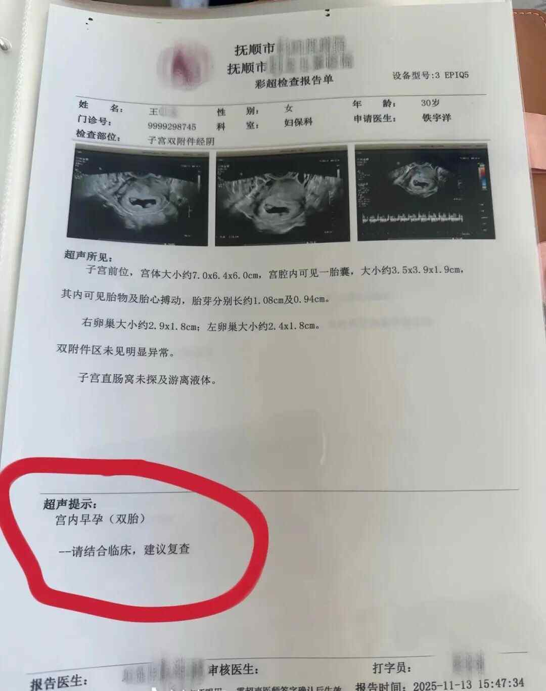 据王女士讲述,她今年30岁,去年9月份自然受孕,11月在抚顺市妇幼保健院做了三次产检,第一次检查时是单胎,第二次检查是双胎,第三次检查结果为三胎。为了弄清楚具体情况,去年12月,王女士到沈阳市妇婴医院进行复检,彩超结果显示为四胎。