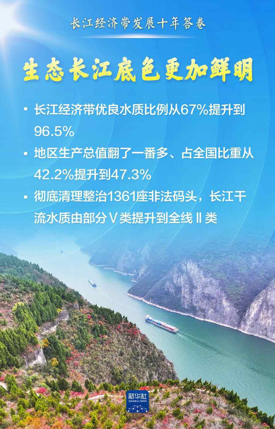 长江经济带发展是我国区域重大战略。十年来,长江经济带共抓大保护、不搞大开发,优良水质比例从67%提升到96.5%;地区生产总值翻了一番多、占全国比重提升到47.3%;形成了汽车制造、电子信息等一批世界级产业集群……保护和发展的相互促进、相得益彰,书写了人与自然和谐共生的中国式现代化时代篇章。