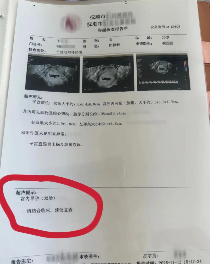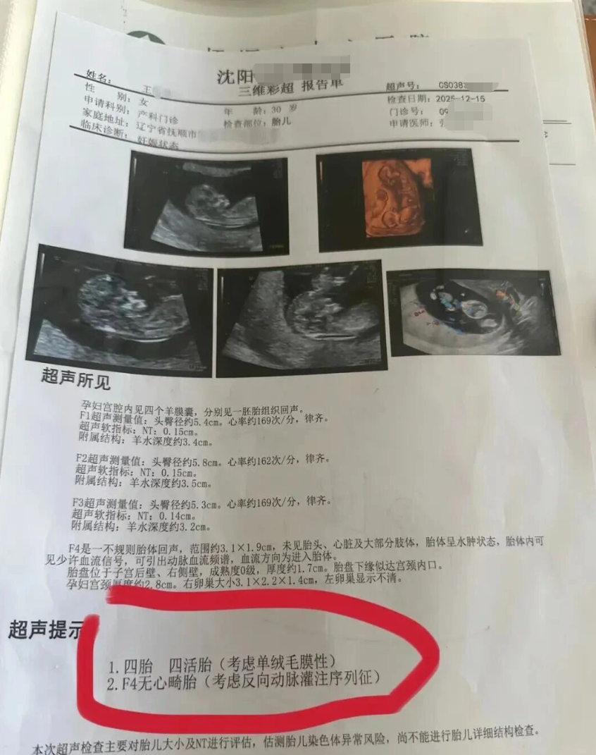 王女士表示,她去年9月份自然受孕,11月在抚顺市妇幼保健院做了三次产检,第一次检查时是单胎,第二次检查是双胎,第三次检查结果为三胎。为弄清楚情况,去年12月,王女士到沈阳市妇婴医院进行复检,彩超结果显示为四胎。