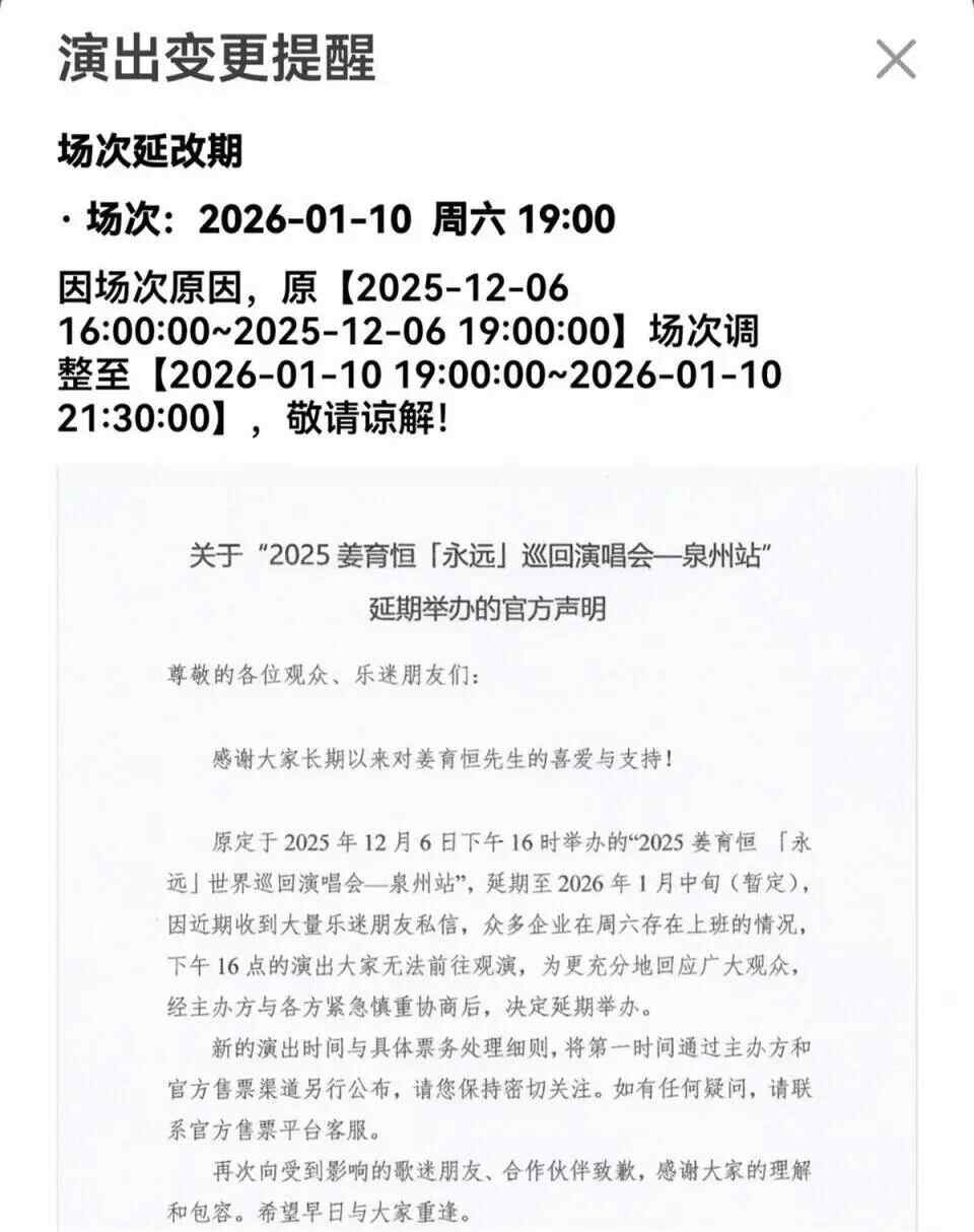 2025年11月25日,摩登星空发布声明称,原定于2025年12月6日下午4时举办的2025姜育恒“永远”世界巡回演唱会泉州站,延期至2026年1月中旬(暂定)。