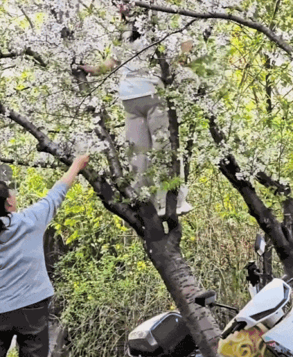 视频显示,一辆电动车停靠在一株樱花树边,一名女子爬上树干并站立,身旁另有女子为其递送手机,过程中樱花树被压倒。