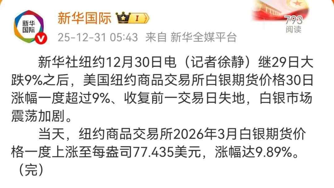 继29日大跌9%之后,美国纽约商品交易所白银期货价格30日涨幅一度超过9%、收复前一交易日失地,白银市场震荡加剧。当天,纽约商品交易所2026年3月白银期货价格一度上涨至每盎司77.435美元,涨幅达9.89%。