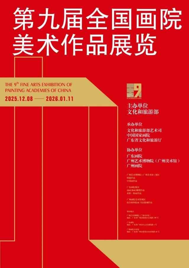地点:广州艺术博物院(广州美术馆)2-11,15-17号厅(特邀作品、中国画作品);广东画院(油画、版画、雕塑作品、水彩·粉画作品);广州画院(综合材料绘画、书法篆刻作品)