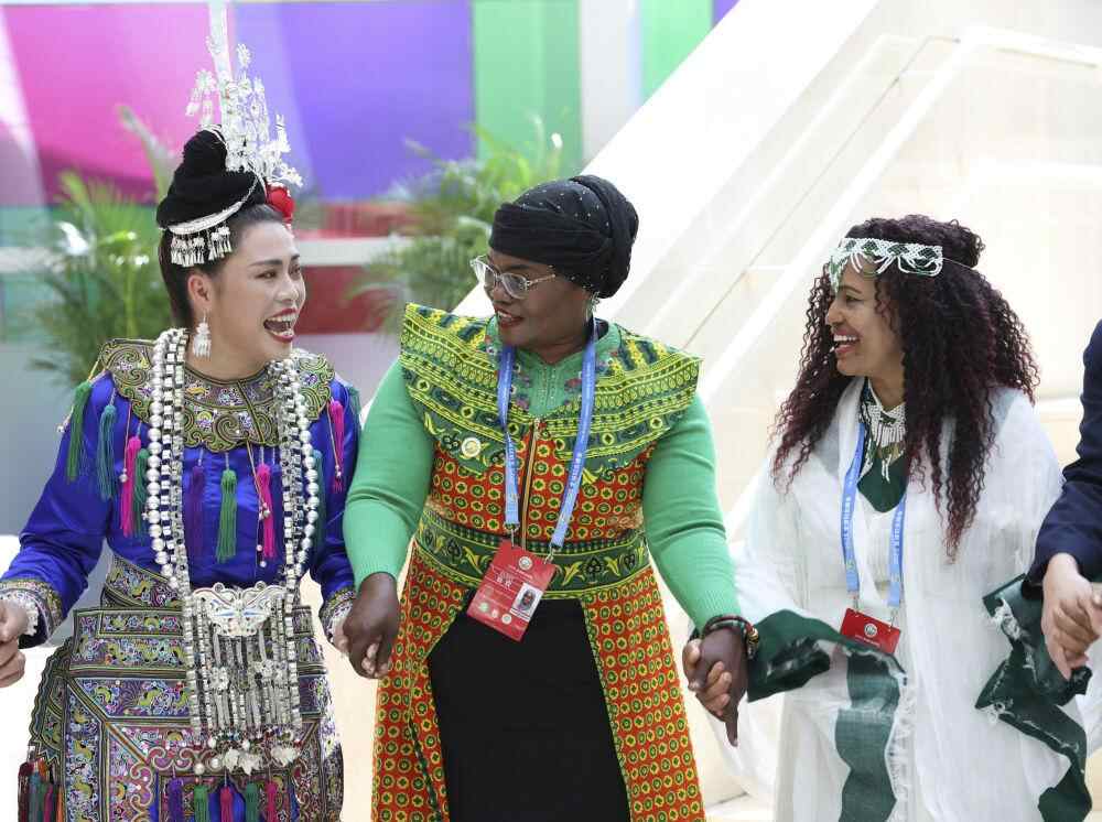 2025年10月14日,在全球妇女峰会配套活动“数智赋能妇女和女童成果展”,来自坦桑尼亚和埃塞俄比亚的嘉宾与侗族大歌表演者们一起载歌载舞。新华社记者 梁旭 摄