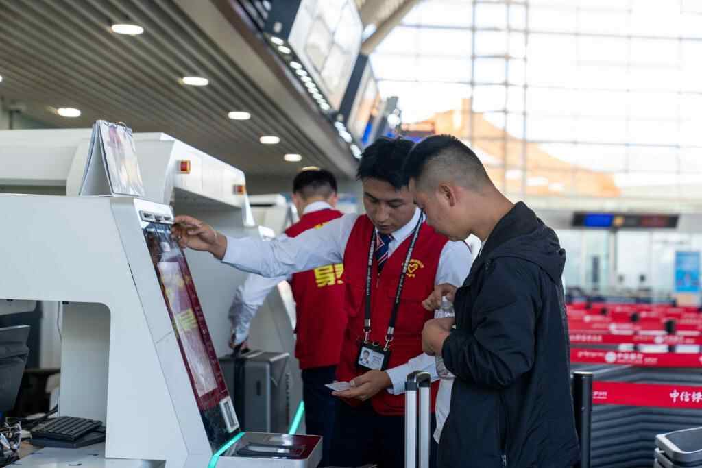 7月18日,拉萨贡嘎国际机场工作人员在帮旅客办理行李托运手续。新华社记者旦增尼玛曲珠 摄