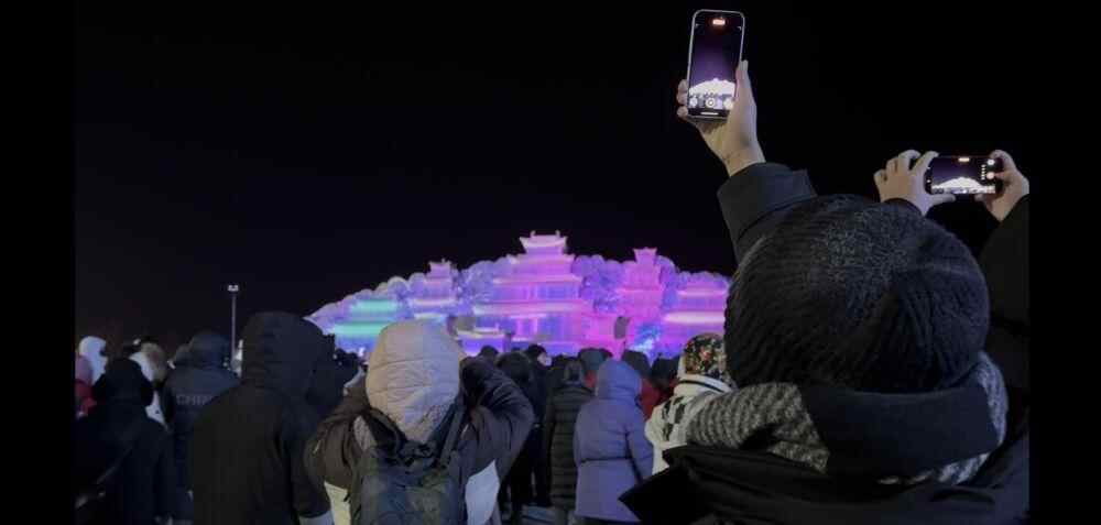 夜幕降临,长白山麓的夜色被灯火与欢呼声点亮。来自辽宁的“95后”游客李然举着相机连拍,镜头里既有雪雕光影的璀璨,也有她与“青铜门”的创意合影。