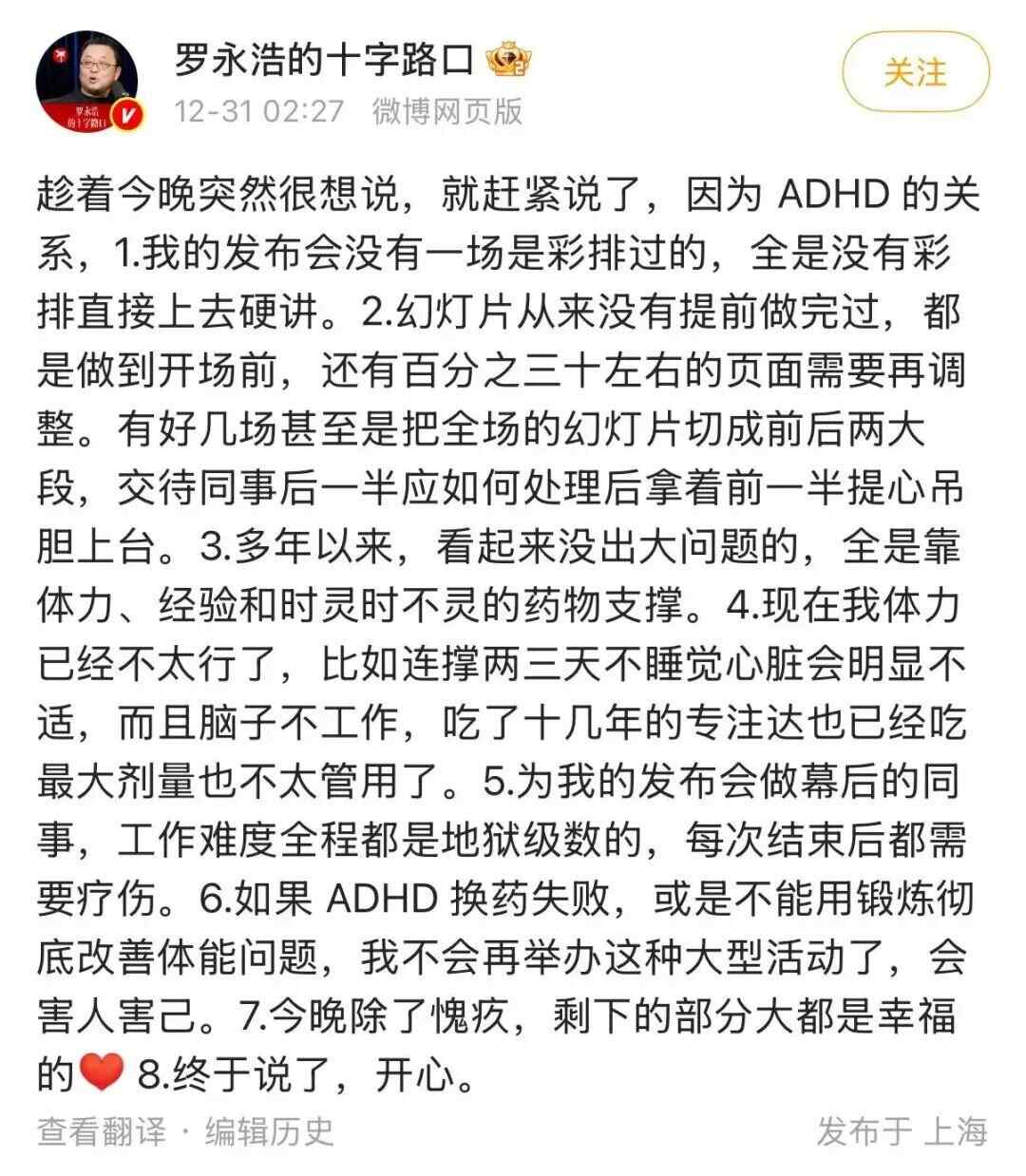 也是因此,在工作中,成人ADHD患者极易出现虎头蛇尾、拖延、频繁更换工作等情况,其在规划组织、时间管理、工作记忆等方面的能力会受到影响,这些均与罗永浩发文中“发布会从不彩排”“幻灯片从未提前做完”等情况有所对应。