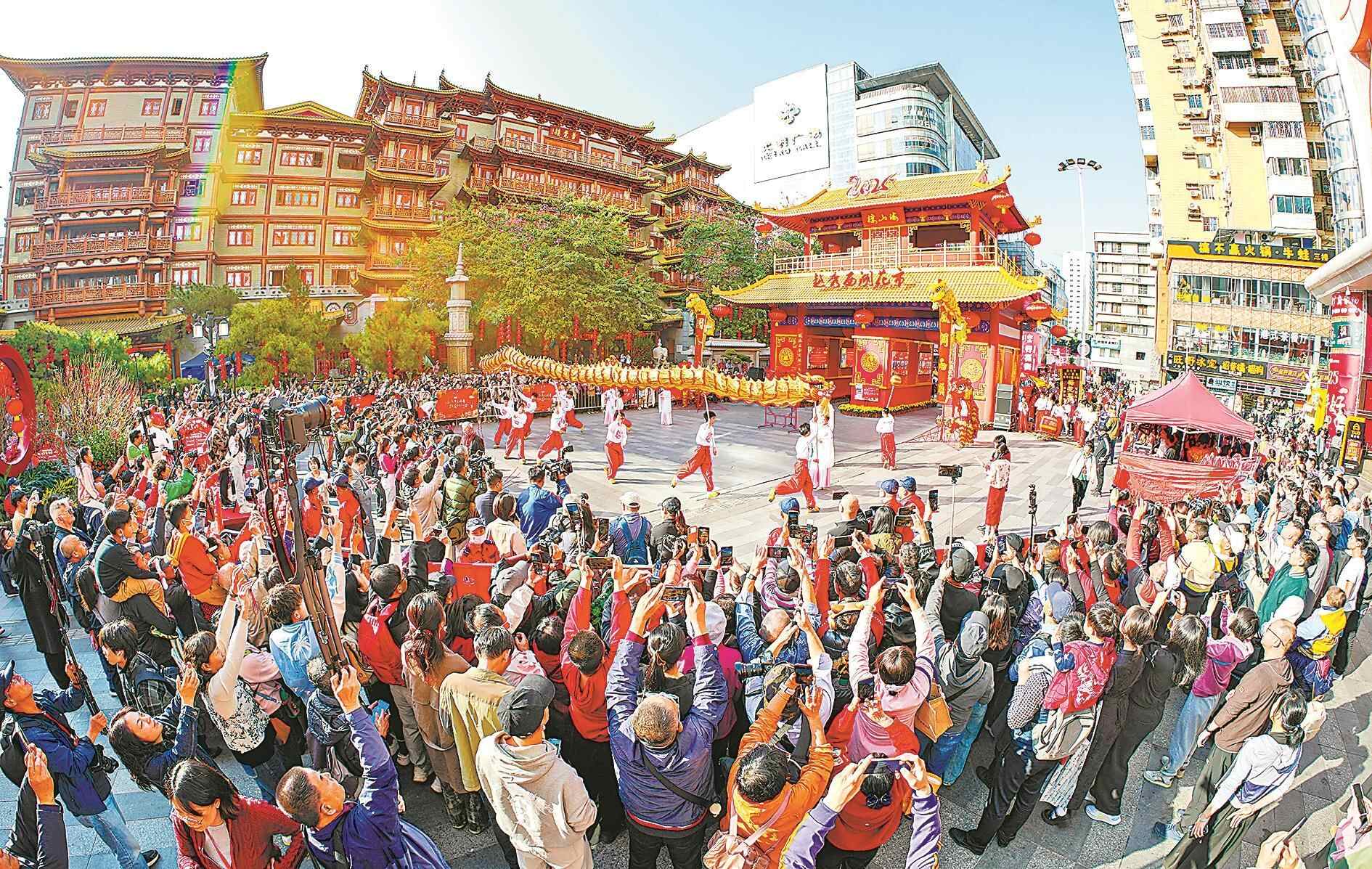 精品文化名片贯穿全年,让城区魅力四季常新。其中,“广府味·幸福年”已成为激活传统节庆现代消费的典范。春节期间,集非遗、美食、演艺、灯会于一体的系列活动,成功将巨大的人流转化为实实在在的消费流与口碑传播。人文经济正迸发消费潜能,2025年“广府味·幸福年”活动累计接待市民游客近800万人次,带动消费近4亿元。2026年“广府味·幸福年”新春系列活动将于今年12月31日启动,持续至2026年3月9日,以“广府十二年味”为主线,营造“年味越秀”浓厚氛围,展现人文经济的越秀画卷。