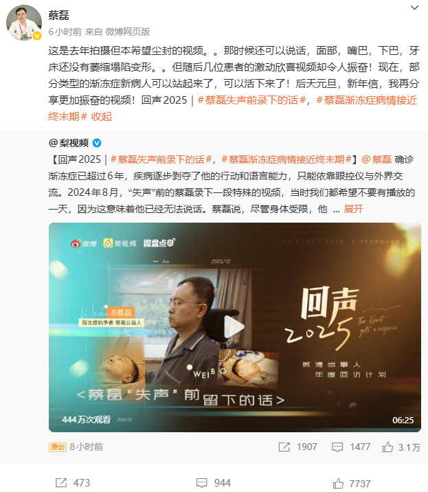 而视频文案则提到:“蔡磊确诊渐冻症已超过6年,疾病逐步剥夺了他的行动和语言能力,只能依靠眼控仪与外界交流。2024年8月,‘失声’前的蔡磊录下一段特殊的视频,当时我们都希望不要有播放的一天,因为这意味着他已经无法说话。蔡磊说,尽管身体受限,他还将不遗余力地与社会各界一起,与渐冻症抗争到生命最后一刻。