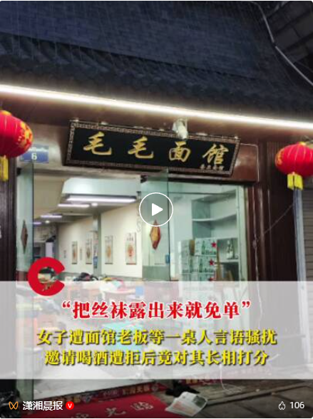 12月29日,女子到浙江杭州旅游,在一家面馆用餐时遭老板一桌人骚扰,对方邀请喝酒,被女子一行人拒绝后,对方开始对其进行长相打分。