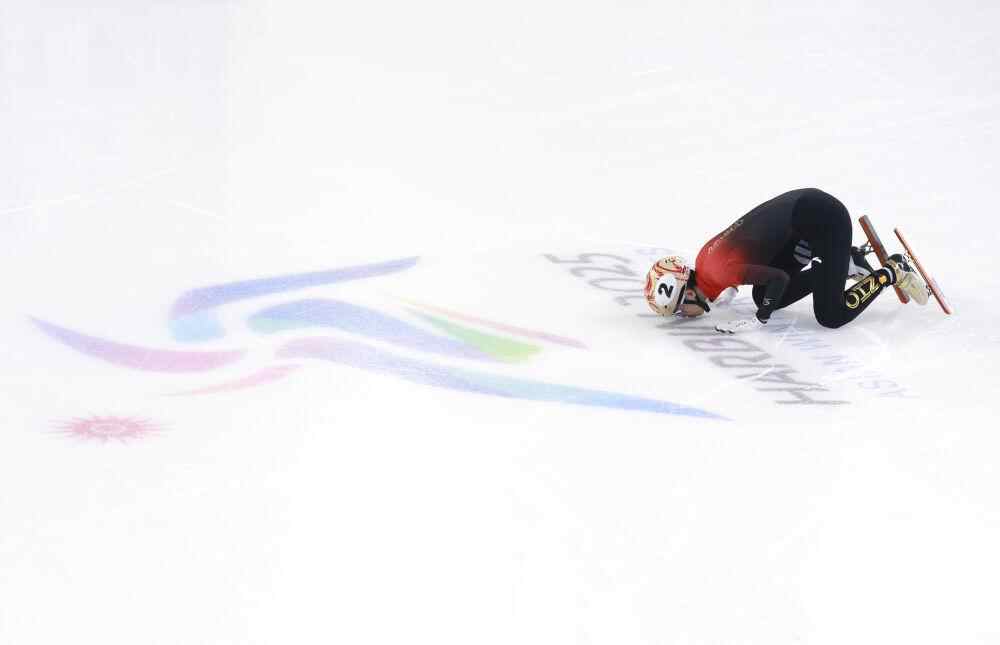 ↑2月9日,在第九届亚冬会短道速滑女子3000米接力A组决赛后,获得冠军队的中国队选手范可新申请亲吻冰面。这是范可新最后一次参加亚冬会。新华社记者 许雅楠 摄