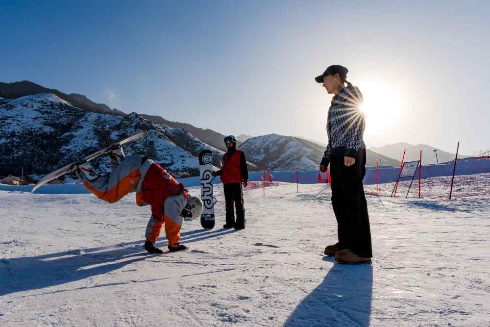 ↑3月6日,许秀娟(右)在新疆白云国际滑雪场指导年轻教练。来自东北的许秀娟,曾经是单板滑雪国家队队员、教练员,如今已成为了新疆白云国际滑雪场的单板滑雪总教练。随着新疆承办的大型滑雪赛事越来越多,许秀娟也担任起裁判员一职。新华社记者 徐宏岩 摄