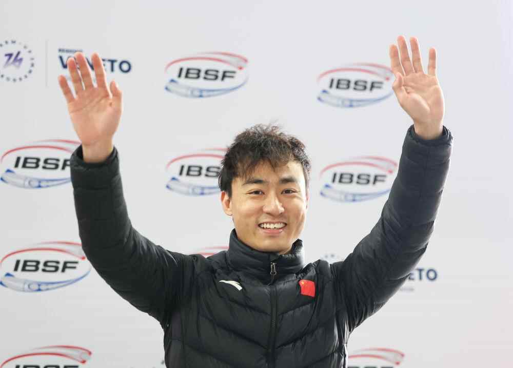 ↑11月21日,中国选手殷正在国际雪车联合会世界杯系列赛科尔蒂纳丹佩佐站钢架雪车男子个人赛中获得季军。新华社记者 李京 摄