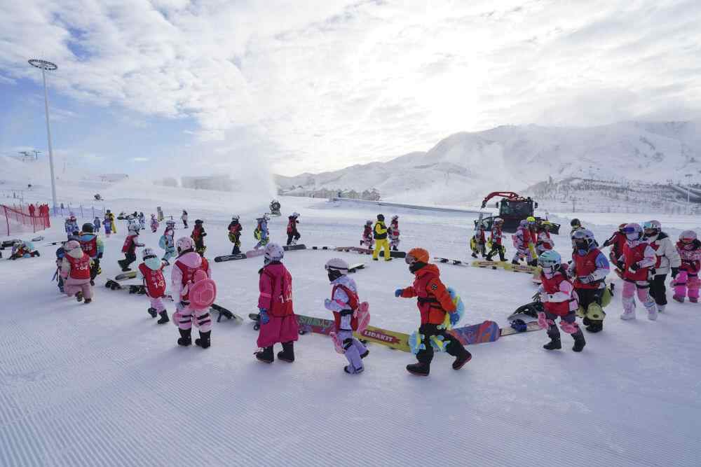 ↑12月1日,学生在阿勒泰将军山国际滑雪度假区进行热身运动。2025年12月1日至5日,新疆阿勒泰地区中小学生迎来首个“雪假”。“雪假”期间,阿勒泰市各大滑雪场为学生推出门票减免、雪具租赁优惠等政策,市区公交车对学生全程免费,降低出行成本。新华社记者 阿曼 摄