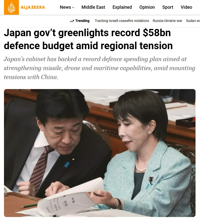 日本政府12月26日批准2026财年(2026年4月至2027年3月)预算案,其中防卫预算超9万亿日元,再创历史新高。其展现出的日本负面军事动向,受到国际媒体关注。