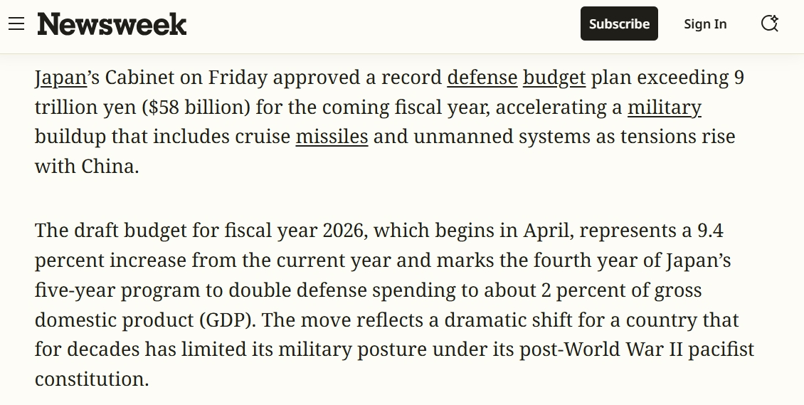 美国《新闻周刊》的报道称,日本2026财年防卫预算比今年增加了9.4%。新预算的一个重点是加强日本“远距离打击敌方目标的能力”,这大大偏离了日本长期以来严格限制使用武力用于自卫的原则。