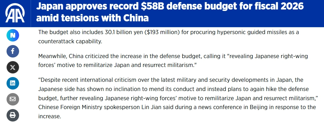 土耳其安纳多卢通讯社26日的报道,列举了日本创纪录防卫预算中涉及的方面,例如无人机、高超音速导弹和航空宇宙自卫队等。同时,报道引述中方的批评称,“近期国际社会对日本的军事安全动向,批评声音不断,日方不但没有反省收敛,反而计划再次大幅增加防卫预算,更加暴露出日本右翼势力推动日本‘再军事化’、企图让军国主义死灰复燃的险恶用心。”