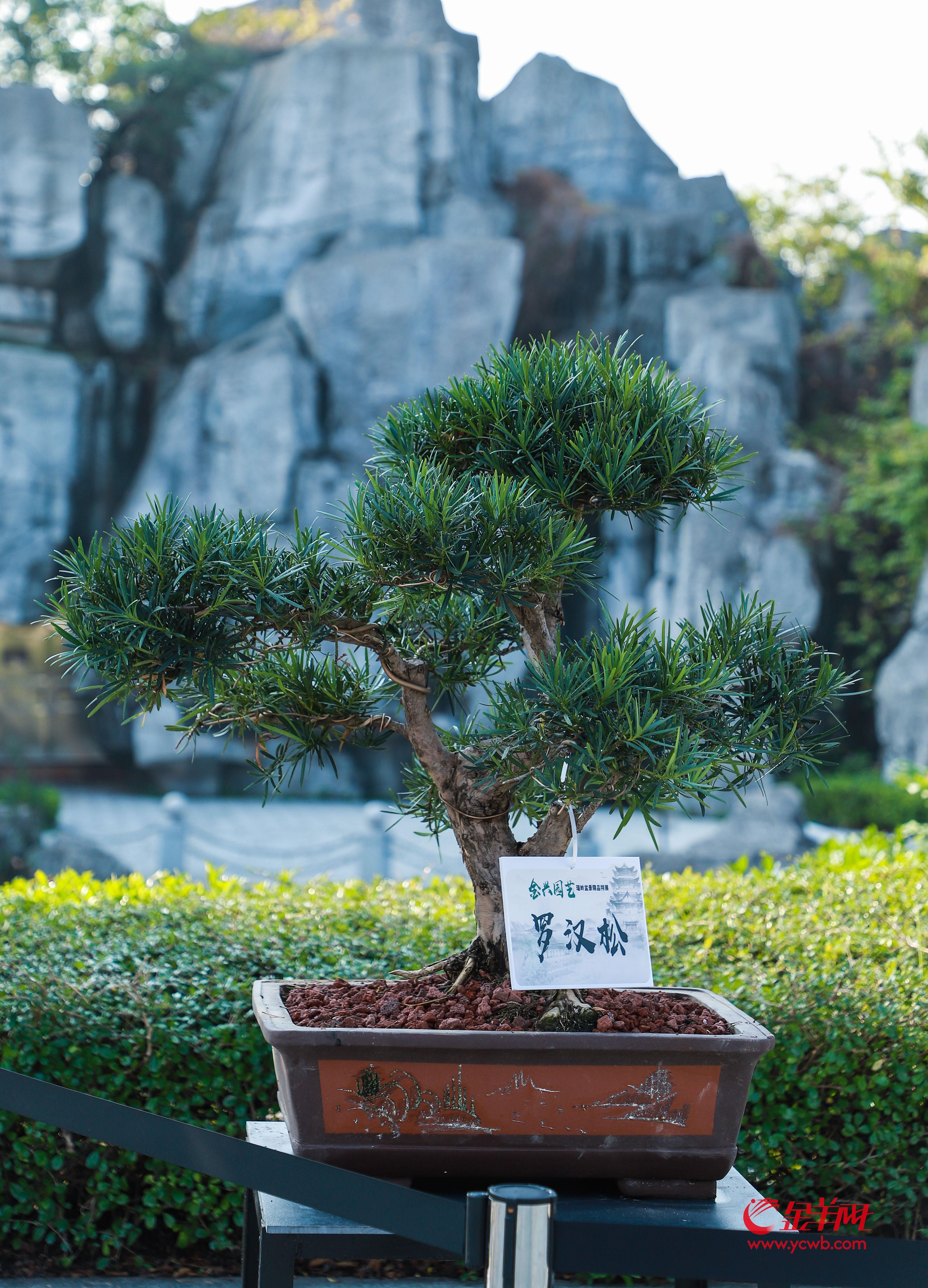 本次展览精选50盆瑞岭盆景佳作,包括九里香、罗汉松、三角梅、红檵木等品种,涵盖斜干式、揽月式、大树式、丛林式等经典造型。展品错落陈列,如一幅幅被赋予了生命、意境与故事的立体画作,赏心悦目,成为广州市文化馆一道亮丽的风景线。