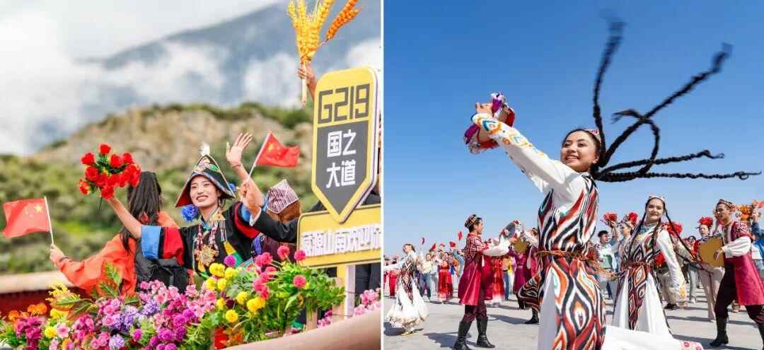 左图:2025年8月21日上午,彩车上的演员通过西藏拉萨市布达拉宫广场时向人群挥手,热烈庆祝西藏自治区成立60周年。右图:2025年9月23日下午,群众载歌载舞,喜迎新疆维吾尔自治区成立70周年